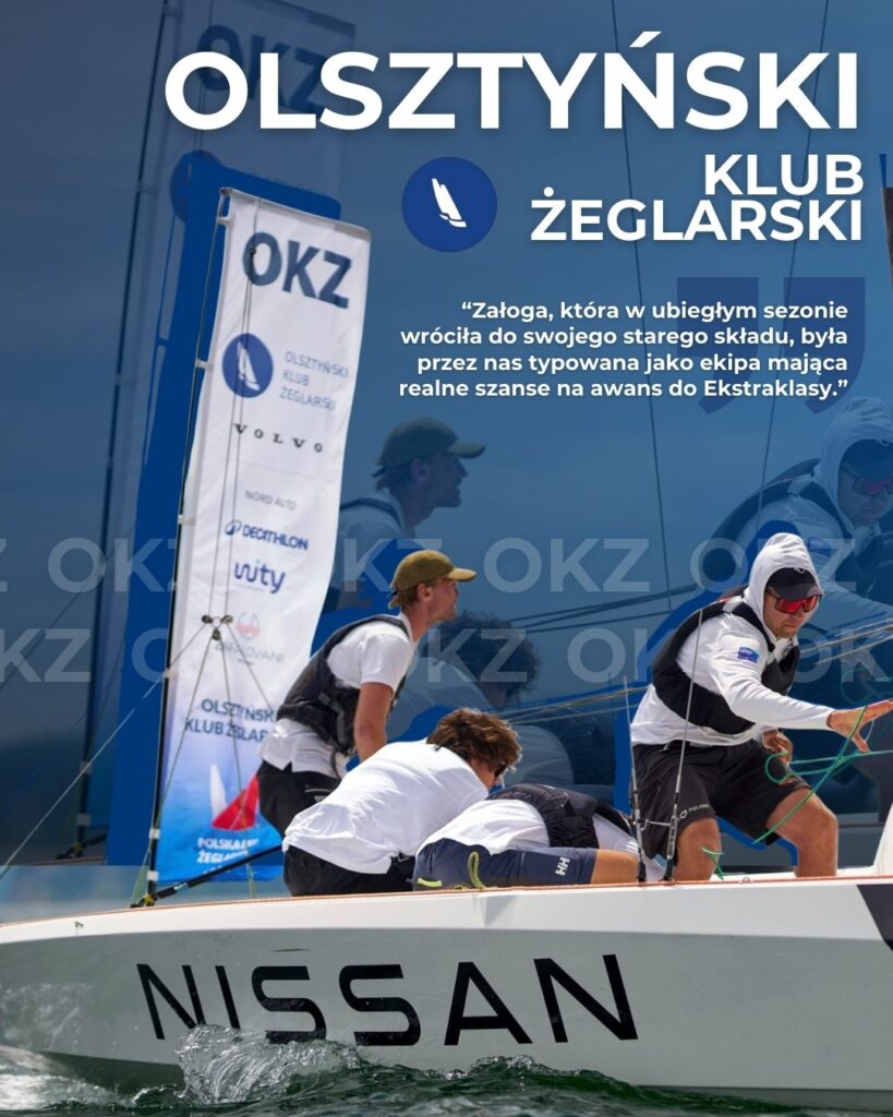 Olsztyński Klub Żeglarski OKŻ – Załoga, która w ubiegłym sezonie wróciła do swojego starego składu, była przez nas typowana jako ekipa mająca realne szanse na awans do Ekstraklasy. W poprzednich latach załoga była prowadzona przez Tosię Janowczyk, natomiast na sezon 2025 na ster wrócił Filip Ciszkiewicz oraz jego kumple Dominik Janowczyk i Jarek Goździk – w przeszłości właśnie w tym zestawieniu OKŻ potrafił wygrywać wyścigi w Ekstraklasie, więc potencjał w tym składzie zdecydowanie jest. Niestety, wyniki w poprzednim sezonie dalekie były od najlepszych lat chłopaków. Pierwszą rundę zakończyli na 5. miejscu, co już było lekkim niedosytem, ale potem z wynikami było tylko gorzej. Załoga zajmowała kolejno 12. miejsce w Gdyni, 7. miejsce w Pucku, a na ostatniej rundzie gdzie Filipa zastąpił Tymoteusz Wysocki, a szybka zmiana nie przyniosła pożądanych rezultatów i niestety skończyli na 15. miejscu. Warto też podkreślić, że jest to jedyny klub w obecnej 1 Lidze z tak długim stażem w Ekstraklasie – od 2017 do 2023 roku. W jakim składzie wystartują na 1 rundzie w Sopocie? To jedno z kluczowych pytań przed kolejnym sezonem.