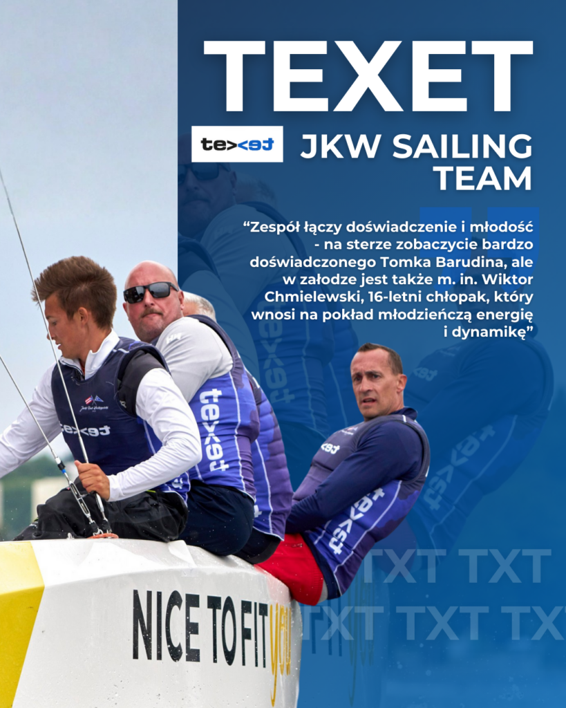 Texet-JKW Sailing Team TXT – Załoga z okolic jeziora Kierskiego, wywodząca się z Wielkopolskiej Ligi Żeglarskiej, w 2025 roku zadebiutowała w 1 Lidze i od razu zapewniła sobie pewne utrzymanie. Nie zaczęli sezonu 2025 najlepiej (14. miejsce w Sopocie), ale potem dali jasny sygnał, że mogą być groźnym rywalem dla reszty stawki, przepływając kolejne rundy na bardzo stabilnych miejscach 9, 9 i 10. Zespół łączy doświadczenie i młodość – na sterze zobaczycie bardzo doświadczonego Tomka Barudina, ale w załodze jest także m. in. Wiktor Chmielewski, 16-letni chłopak, który wnosi na pokład młodzieńczą energię i dynamikę. TXT zakończył sezon idealnie w środku stawki i był zdecydowanie jedną z najsolidniejszych ekip środka tabeli.