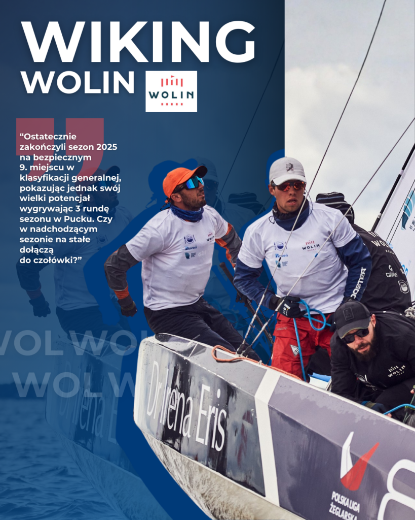 Wiking Wolin WOL – Albatros Wolin wraca w nowej odsłonie jako Wiking Wolin, gotowi walczyć o awans do Ekstraklasy niczym prawdziwi wikingowie. Załogę prowadzi Jeremi Dąbrowski, który przejął ster w ubiegłym sezonie. To młody, ale bardzo doświadczony żeglarz, startujący równolegle w Młodzieżowej Lidze Żeglarskiej w barwach Politechniki Morskiej w Szczecinie oraz będący kiedyś jednym z liderów juniorskiej Kadry Narodowej w klasie 420, reprezentując Polskę m. in. na prestiżowych Młodzieżowych Mistrzostwach Świata World Sailing. W poprzednich latach załoga z Wolina była prowadzona przez jego dobrą koleżankę Weronikę Jaroszek, której w 2023 roku udało się wprowadzić Wolin do Ekstraklasy. Niestety, po jednym sezonie rywalizacji drużyna spadła z najwyższej ligi, a Wolin potrzebował chwili, by się ponownie się rozkręcić. Ostatecznie zakończyli sezon 2025 na bezpiecznym 9. miejscu w klasyfikacji generalnej, pokazując jednak swój wielki potencjał wygrywając 3 rundę sezonu w Pucku. Czy w nadchodzącym sezonie na stałe dołączą do czołówki?