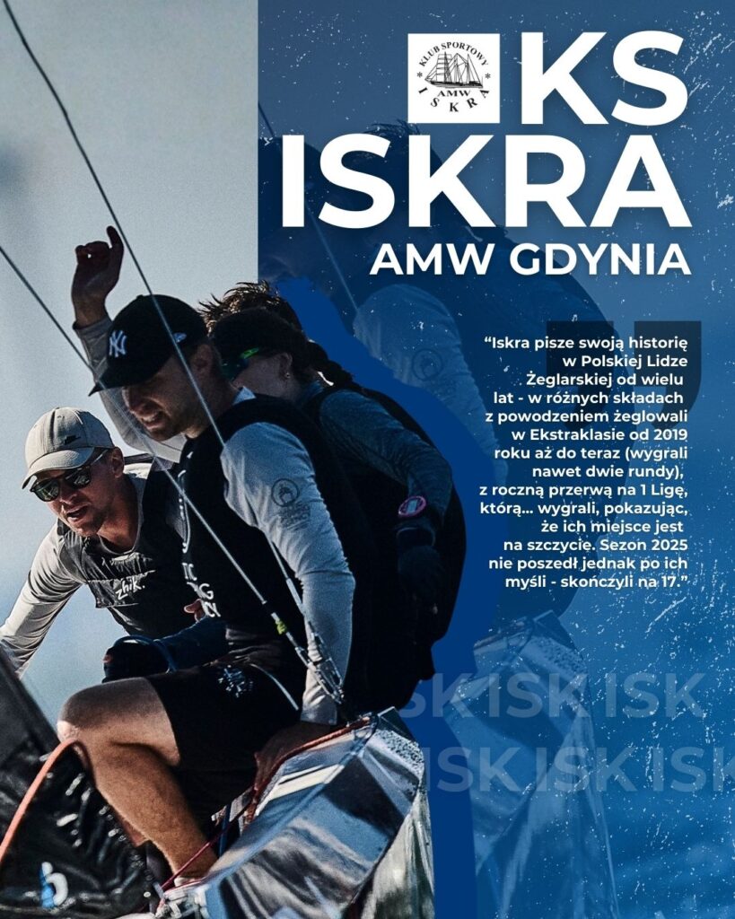 KS Iskra AMW Gdynia ISK – Podobnie jak Wrocław, korzystając z wycofania się dwóch zespołów z Ekstraklasy, otrzymali możliwość ponownego startu na najwyższym poziomie w sezonie 2026. Iskra pisze swoją historię w Polskiej Lidze Żeglarskiej od wielu lat – w różnych składach z powodzeniem żeglowali w Ekstraklasie od 2019 roku aż do teraz (wygrali nawet dwie rundy), z roczną przerwą na 1 Ligę, którą… wygrali, pokazując, że ich miejsce jest na szczycie. Sezon 2025 nie poszedł jednak po ich myśli – skończyli na 17. miejscu i ponownie spadli do 1 Ligi, lecz ich sytuacja diametralnie się zmieniła po rozszerzeniu floty do 10 nowych jachtów RS21.